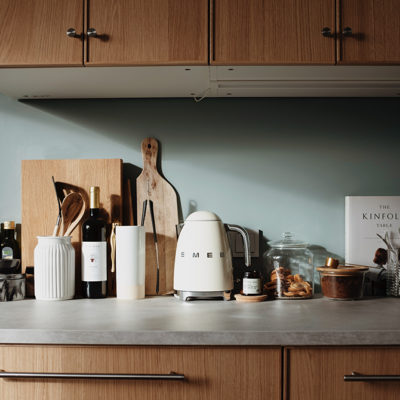 In this example, there is very limited lighting in the kitchen, other than from the ceiling. The lighting is also different temperatures which makes the style inconsistent and a bit messy. There is no task lighting under the cabinets which is resulting in shadows on the worktops, meaning they will be dark and hard to use in the evening.