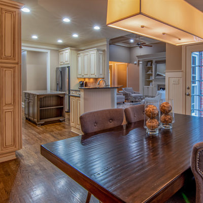 The style of this kitchen is traditional and cosy, yet the ceiling lighting in the kitchen is cool and clinical. This room would be better suited to 3000 kelvin warm white lighting. There appears to be some 2700 kelvin extra warm white lighting under the kitchen cabinets which is bringing an orange tone to the room. Bringing one consistent colour temperature to this space would improve the style immediately.